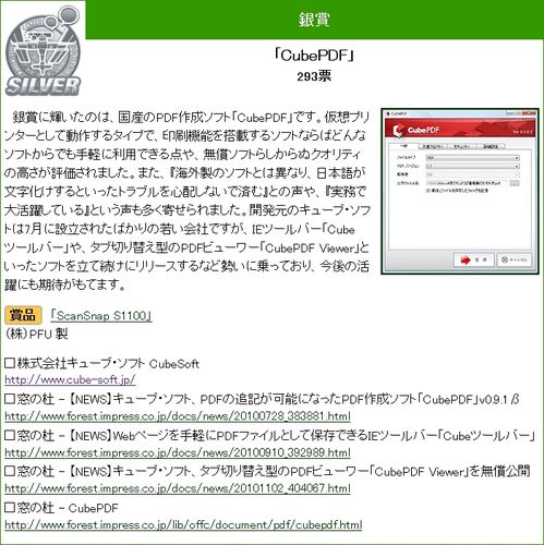 CubePDF が 2010年 窓の杜大賞 にて銀賞を受賞いたしました。魅力的なソフトウェアが多数ノミネートされている中での受賞と言う事で、大変光栄に思っています。ご投票いただいた皆様ありがとうございました。 CubeSoft では、これからも数多くの皆様に使い勝…